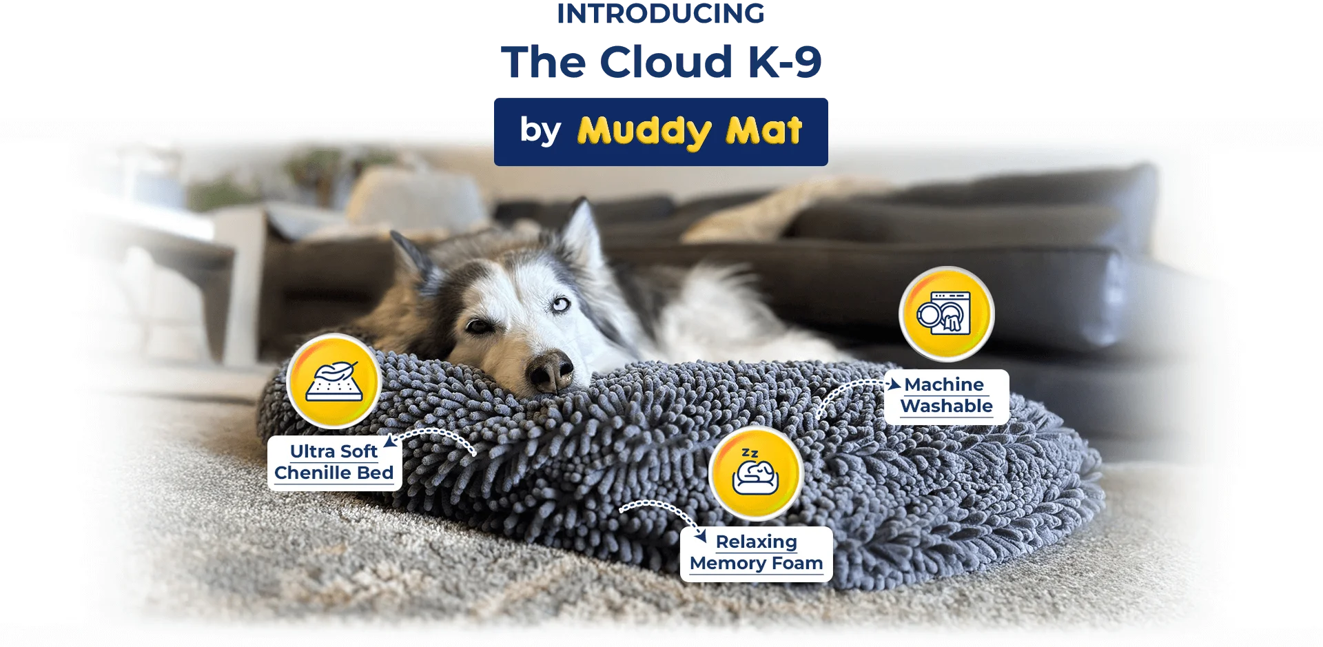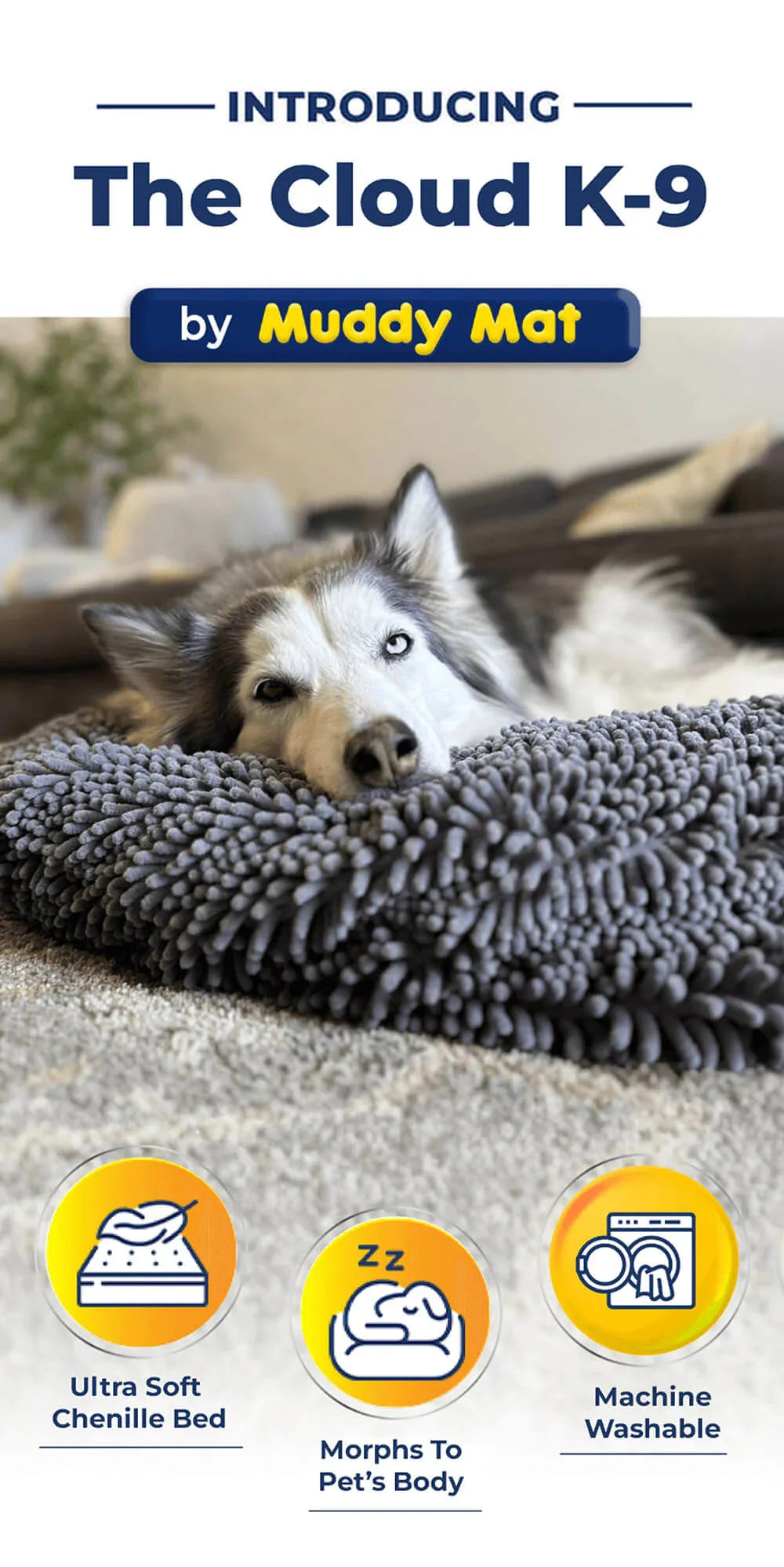 Introducing Cloud K-9 by Muddy Mat, the ultimate cloud bed for dogs that keeps your pet cozy, calm, and clean. Designed by Muddy Mat, these ultra-soft anxiety beds for dogs use the same premium chenille found in our best-selling Anti-Mud Mat to help reduce anxiety while keeping your home cleaner. Unlike ordinary K9 dog beds, the Cloud K-9 helps dry muddy paws, traps dirt, and prevents odors from spreading. It features a quick-dry surface that absorbs moisture after outdoor play and a removable, machine-washable cover for easy cleanup. Durable stitching and non-slip backing also make it perfect for daily use.
