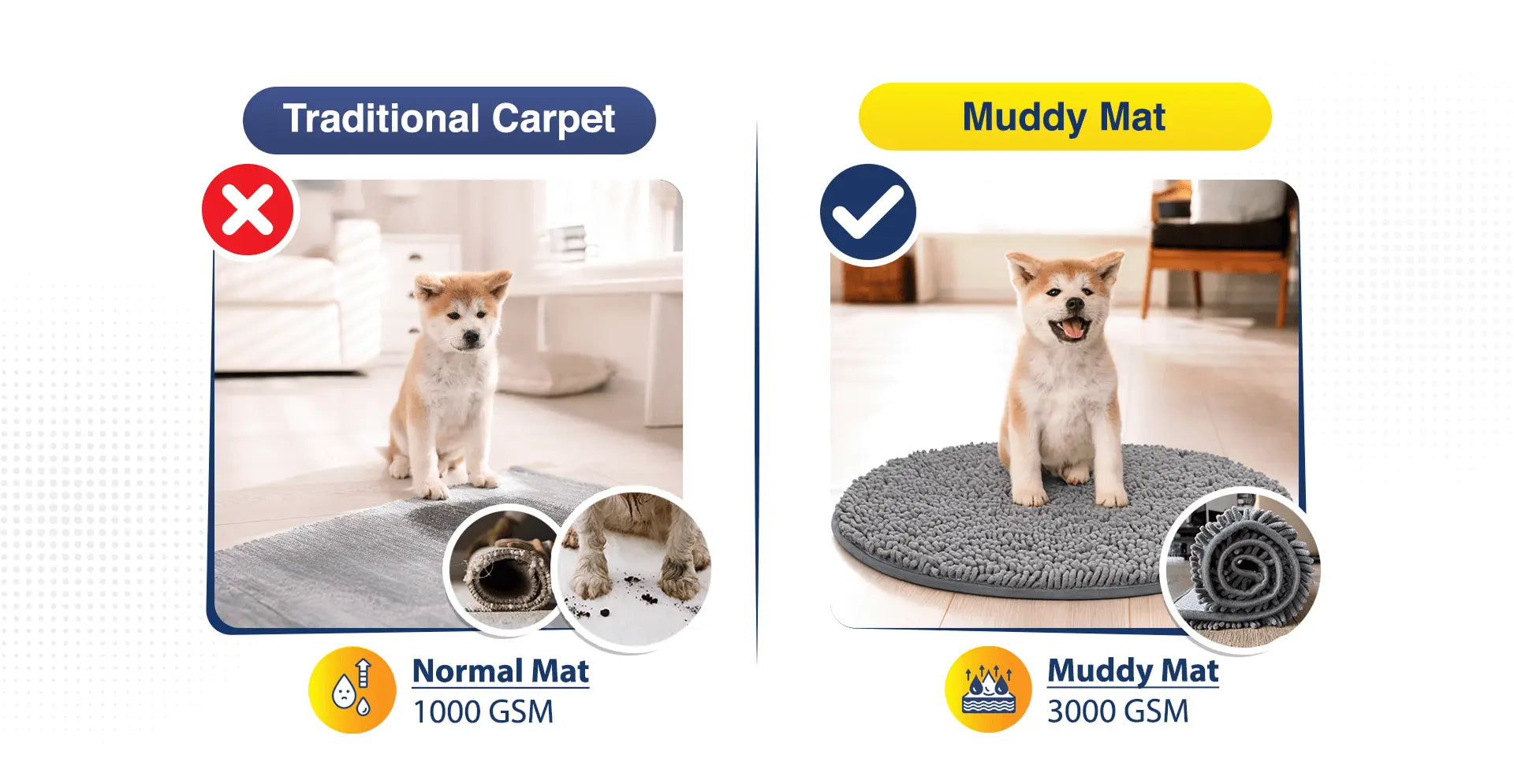 Compared to Normal old doormats, Muddy Mat Soaks Up 5X More Dirt and Water from Paws