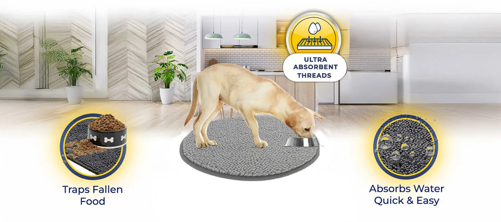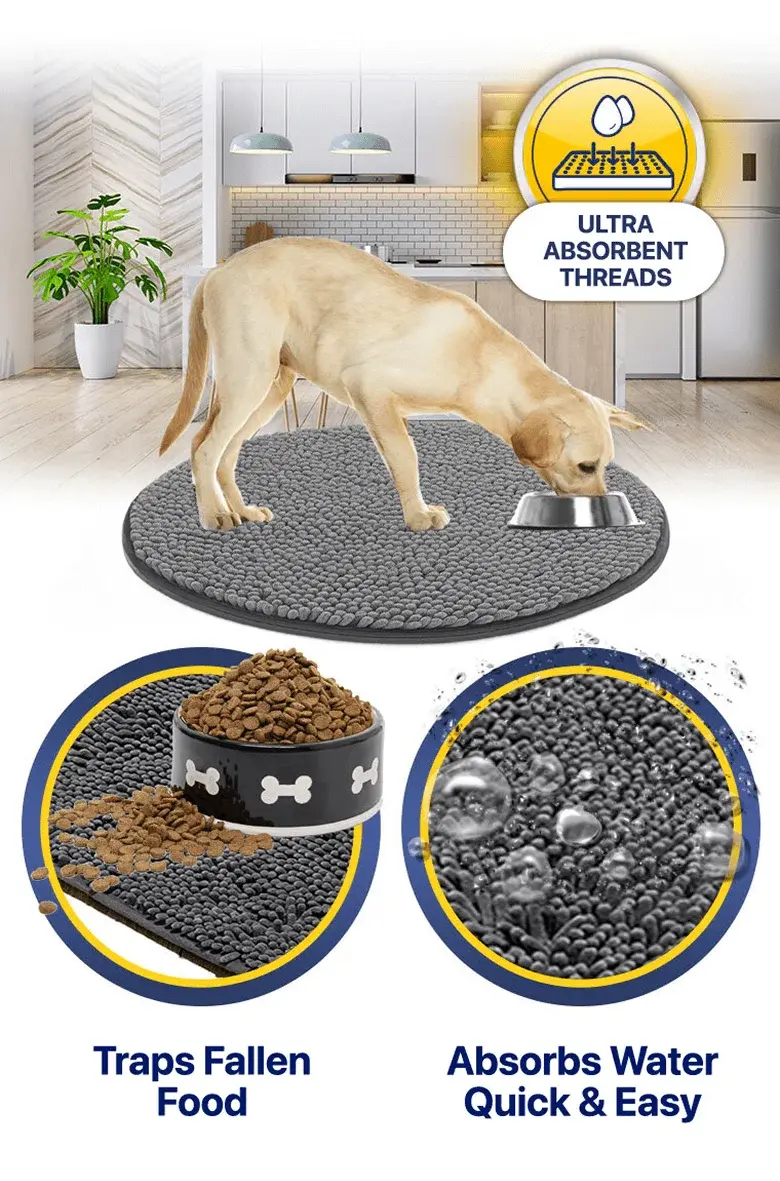 The Muddy Mat will trap any fallen kibble, and absorb All Water For a Quick and Easy Clean Up!