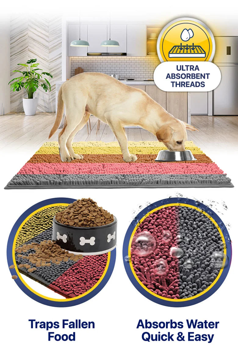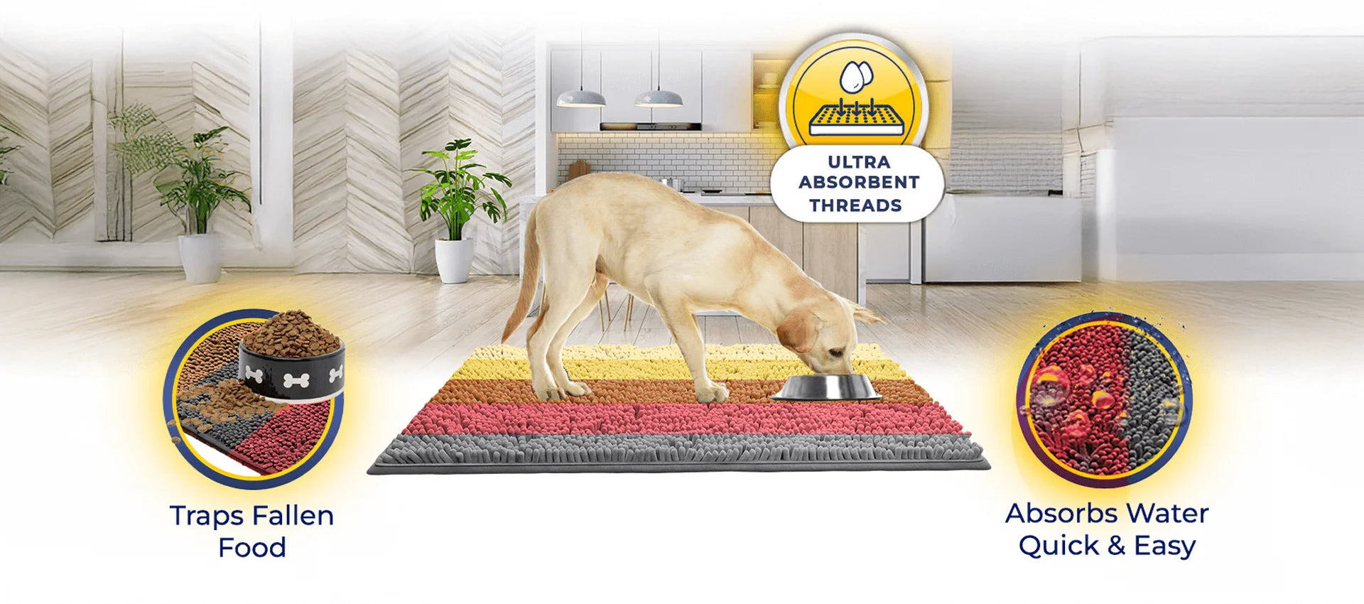 The Muddy Mat will trap any fallen kibble, and absorb All Water For a Quick and Easy Clean Up!