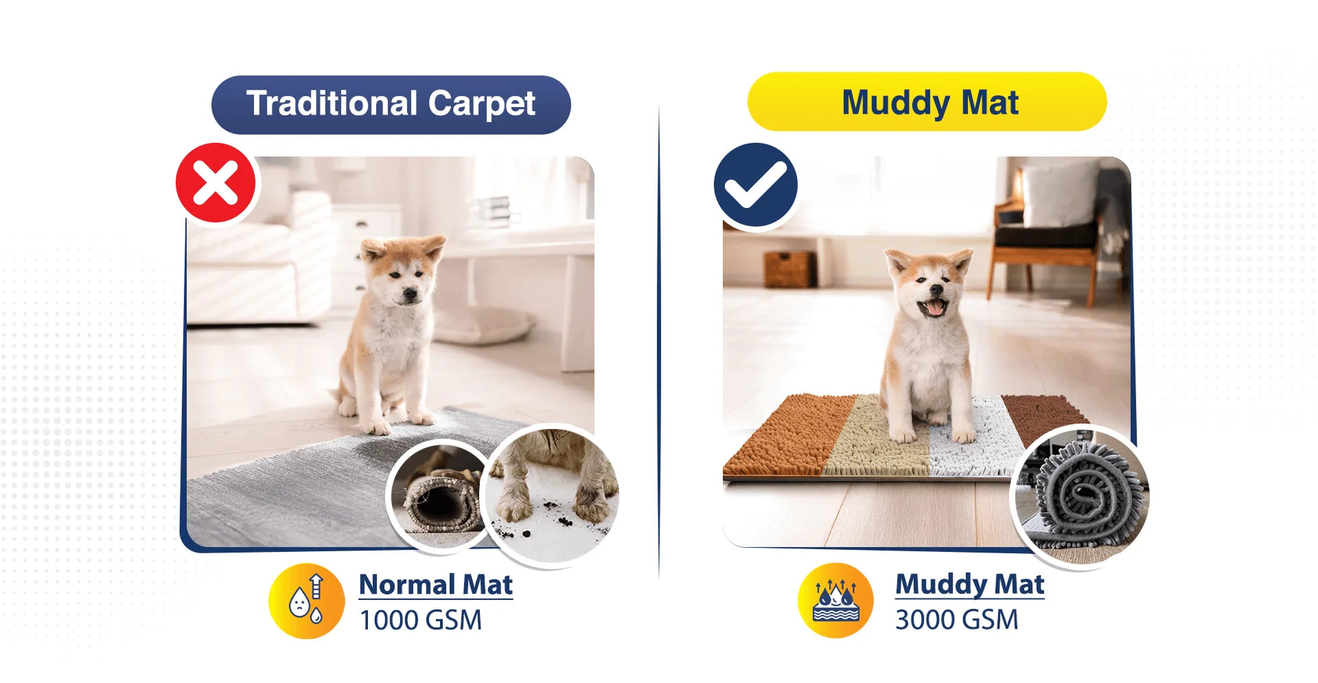 Compared to Normal old doormats, Muddy Mat Soaks Up 5X More Dirt and Water from Paws