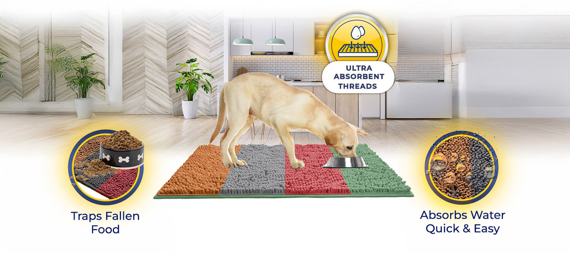 The Muddy Mat will trap any fallen kibble and Absorb All Water For a Quick and Easy Clean-up!