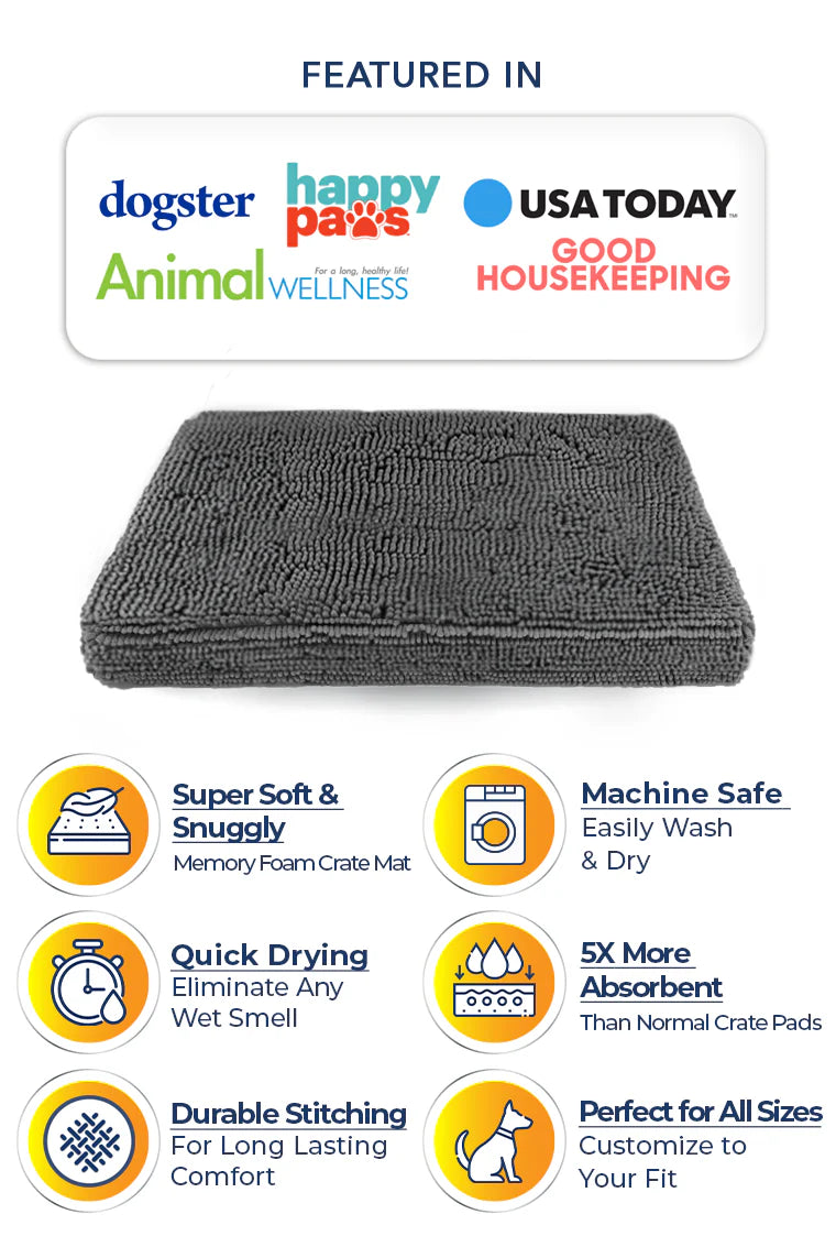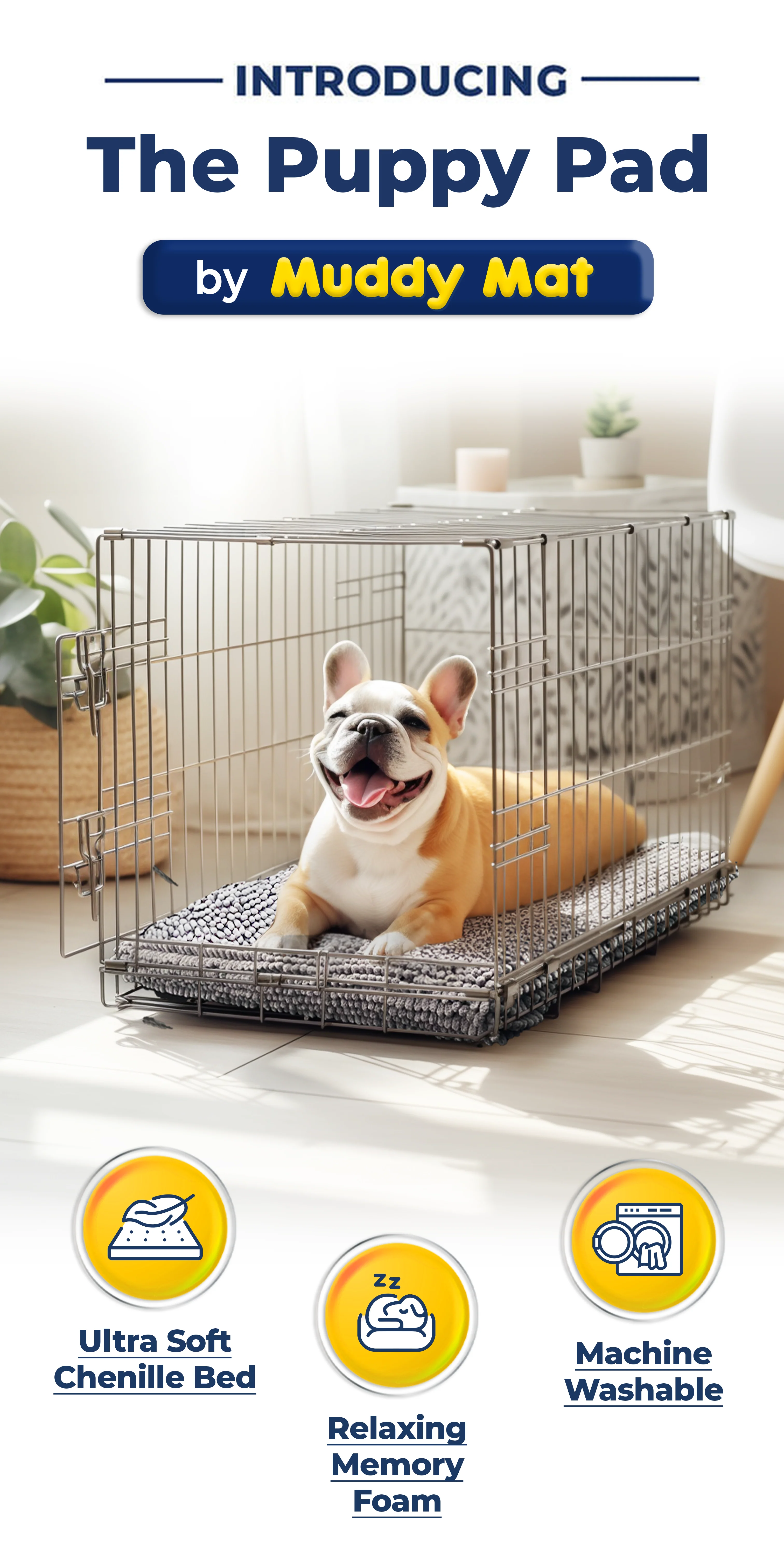 Introducing the Puppy Pad by Muddy Mat! The ultra-soft and relaxing water- and liquid-proof crate bed features the same chenille material as our bestselling Muddy Mat® - Anti-Mud Mat.